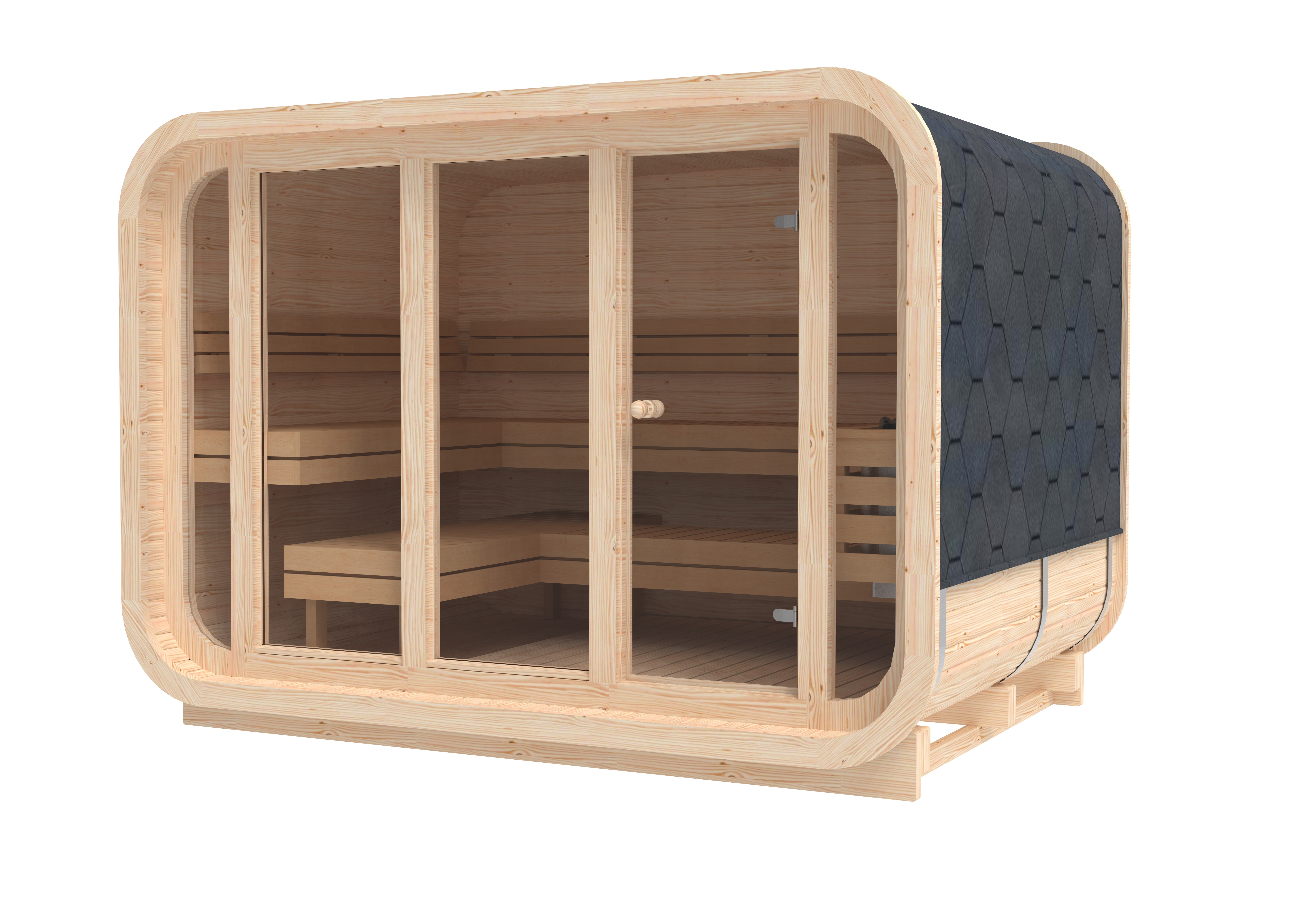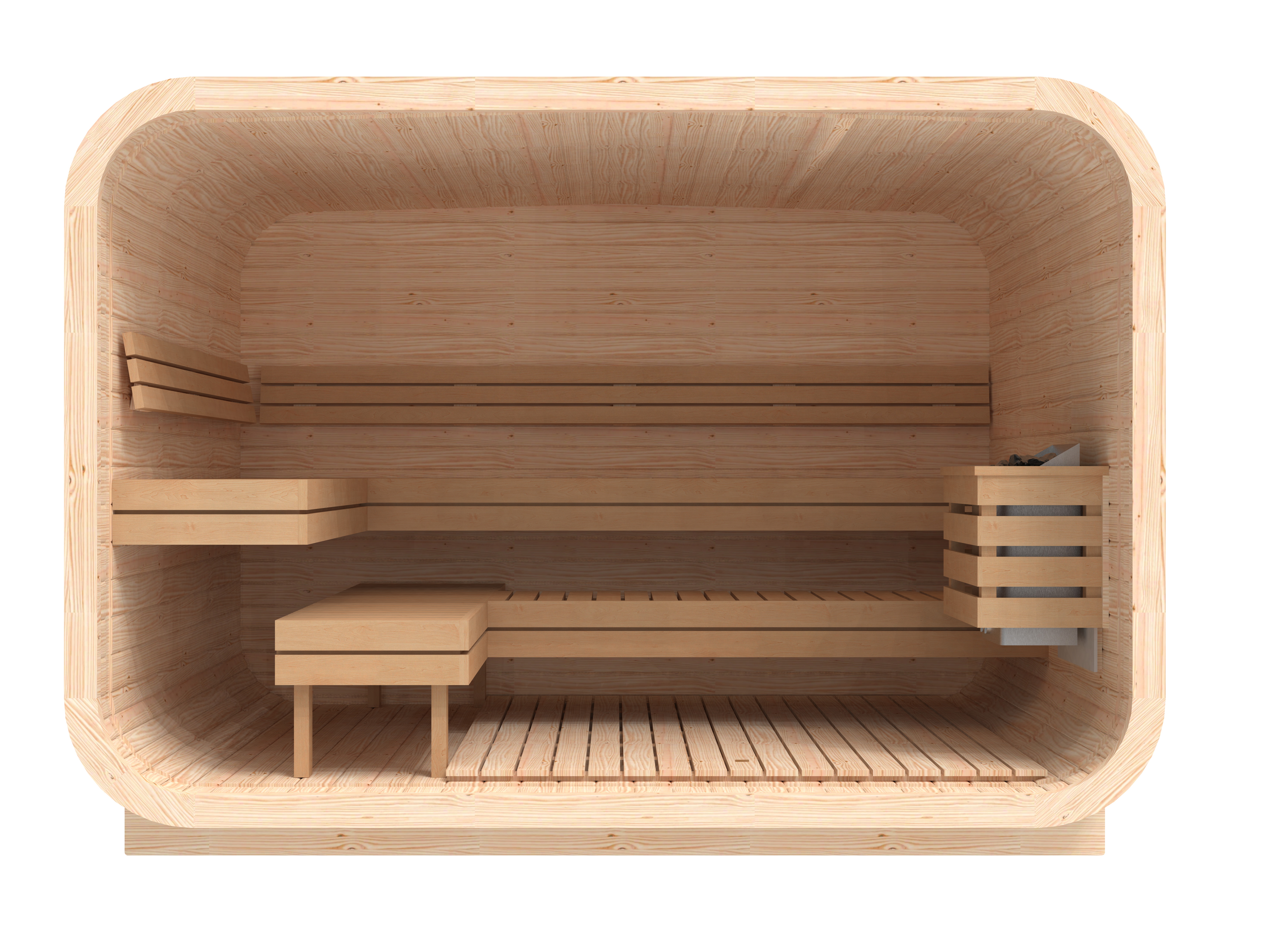 - Bausatz 4-eckige Fasssauna mit einer Gesamtlänge von 230 cm