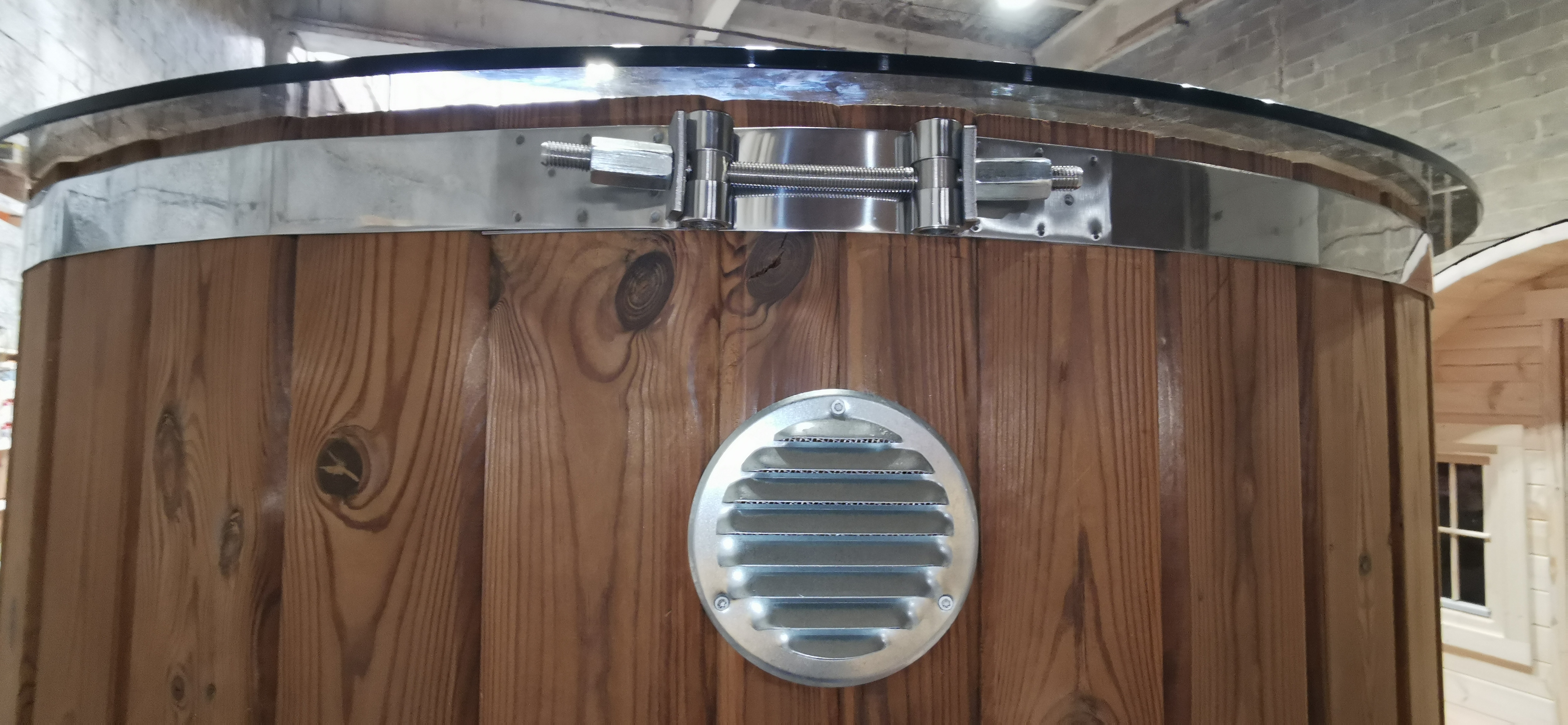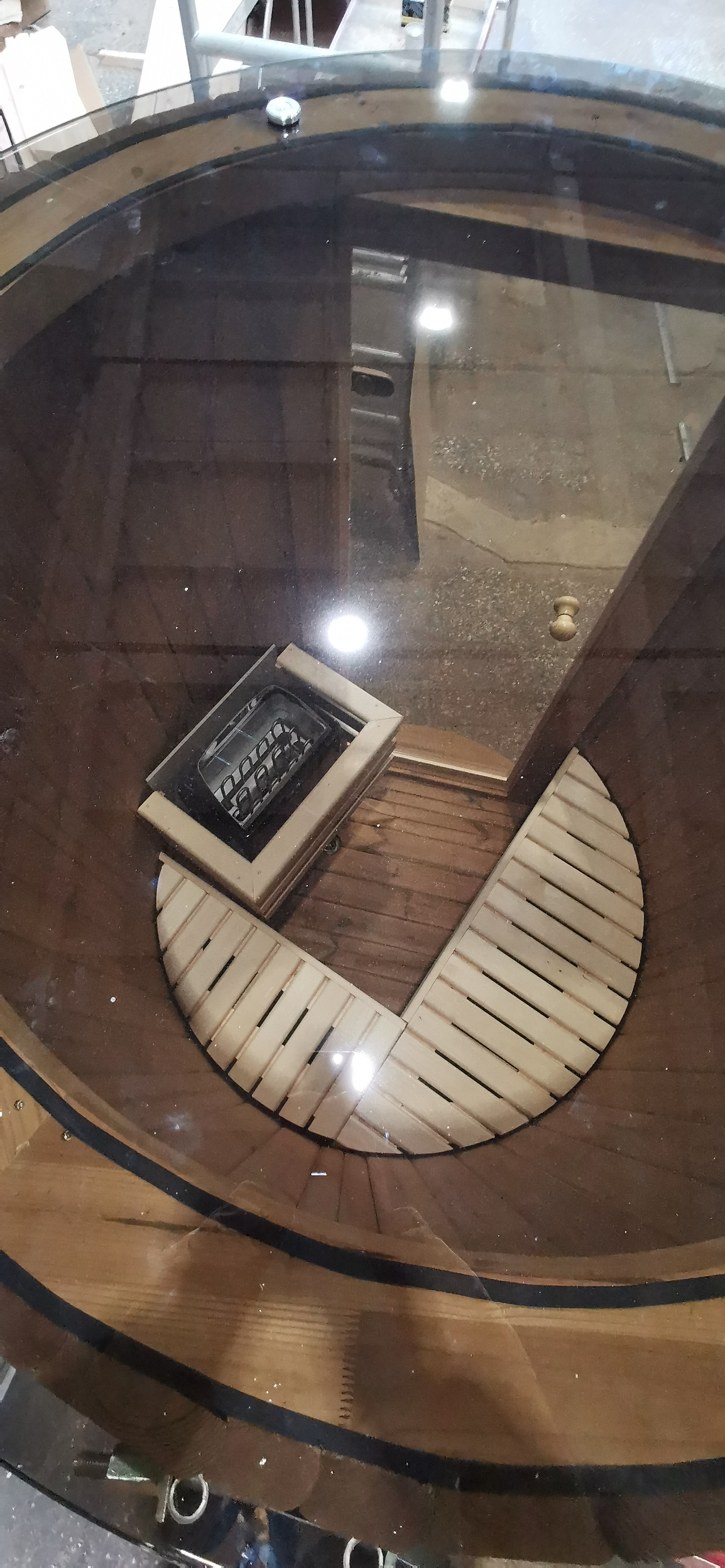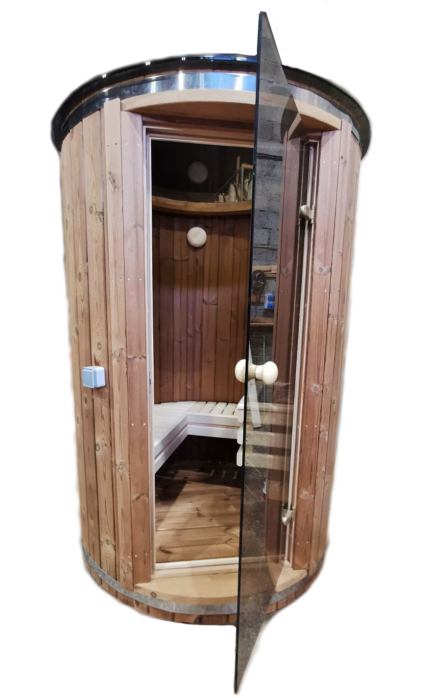- Aufgebaute vertikale (kreisförmige) Fasssauna mit einer Höhe von 220 cm