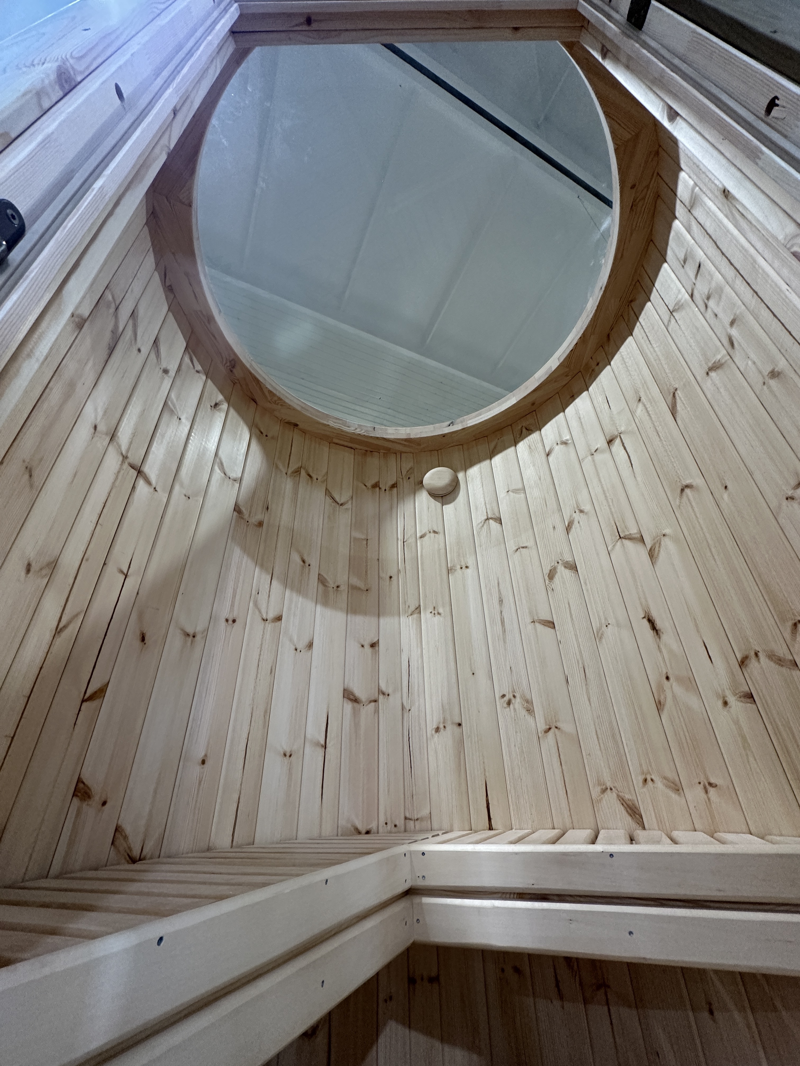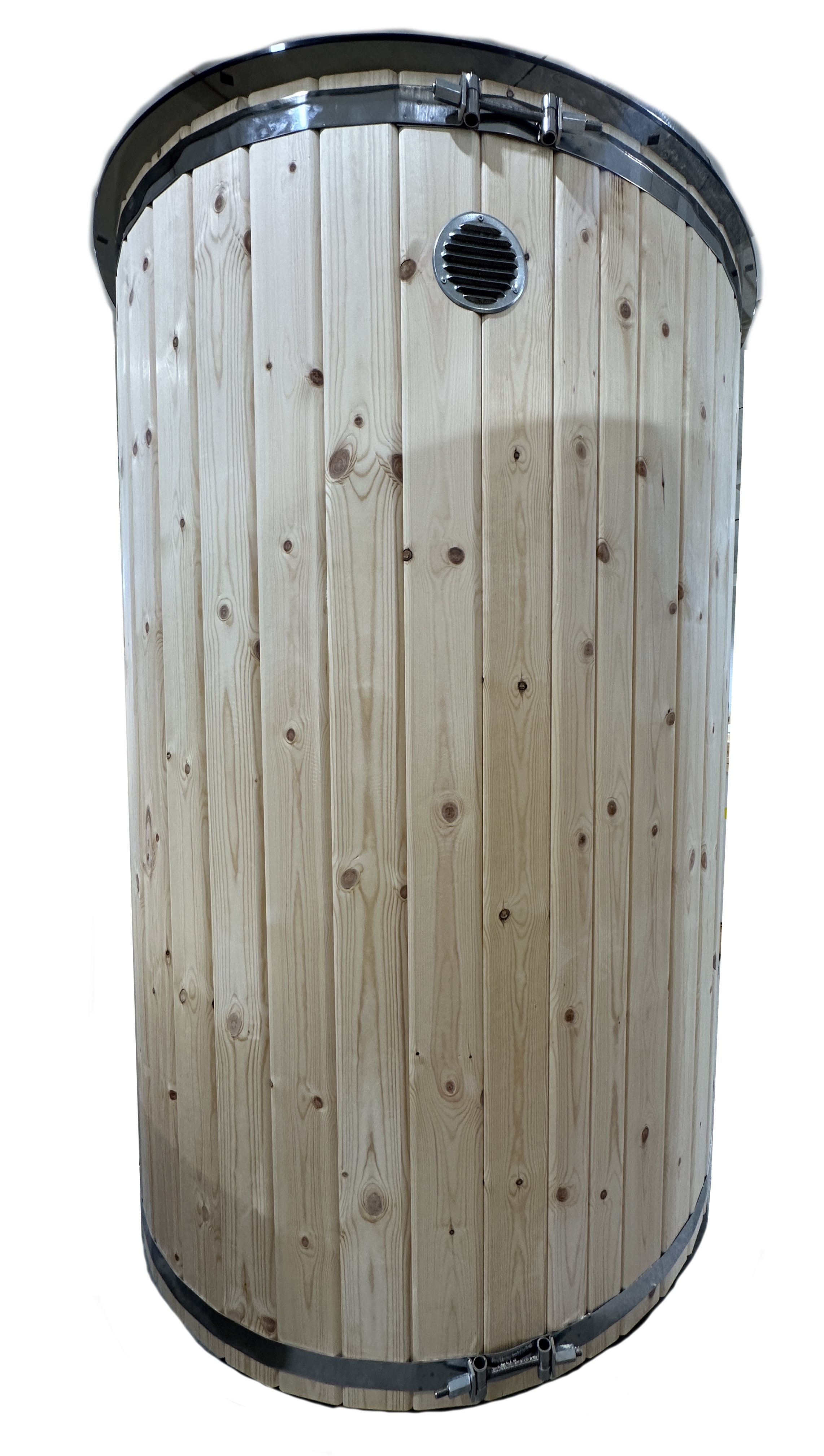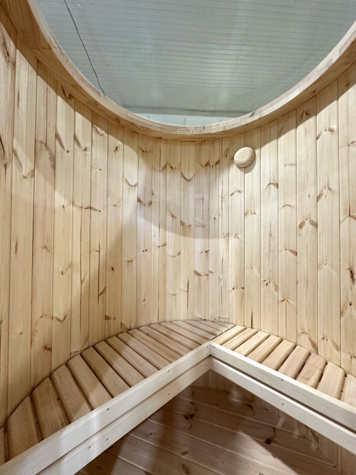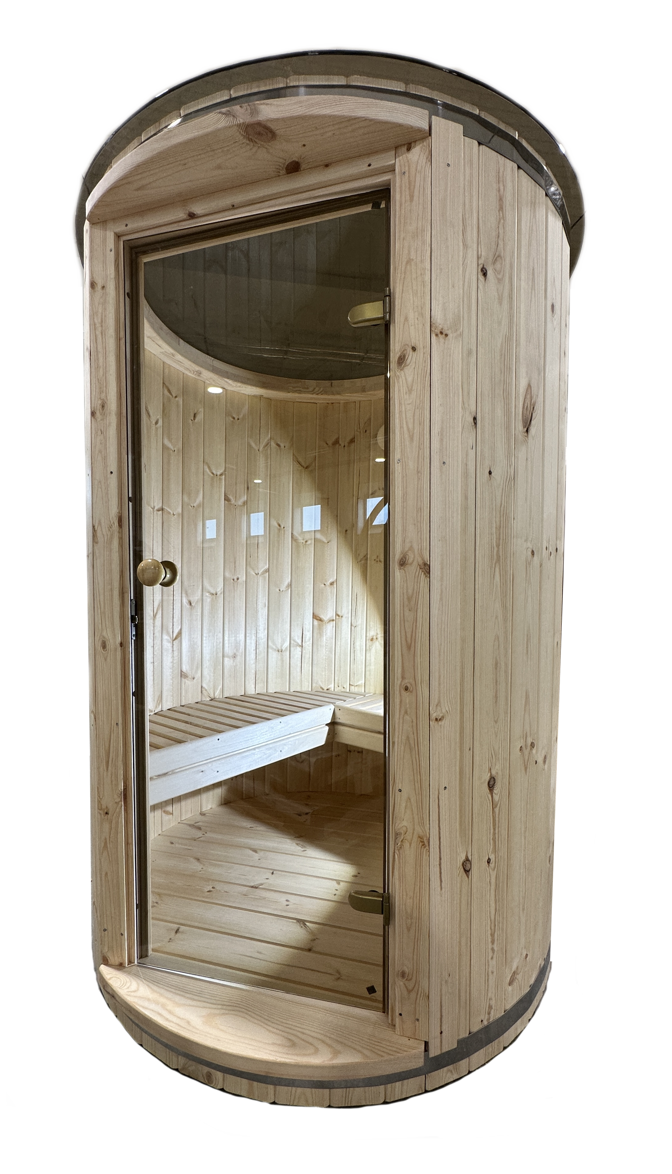 - Aufgebaute vertikale (kreisförmige) Fasssauna mit einer Höhe von 220 cm