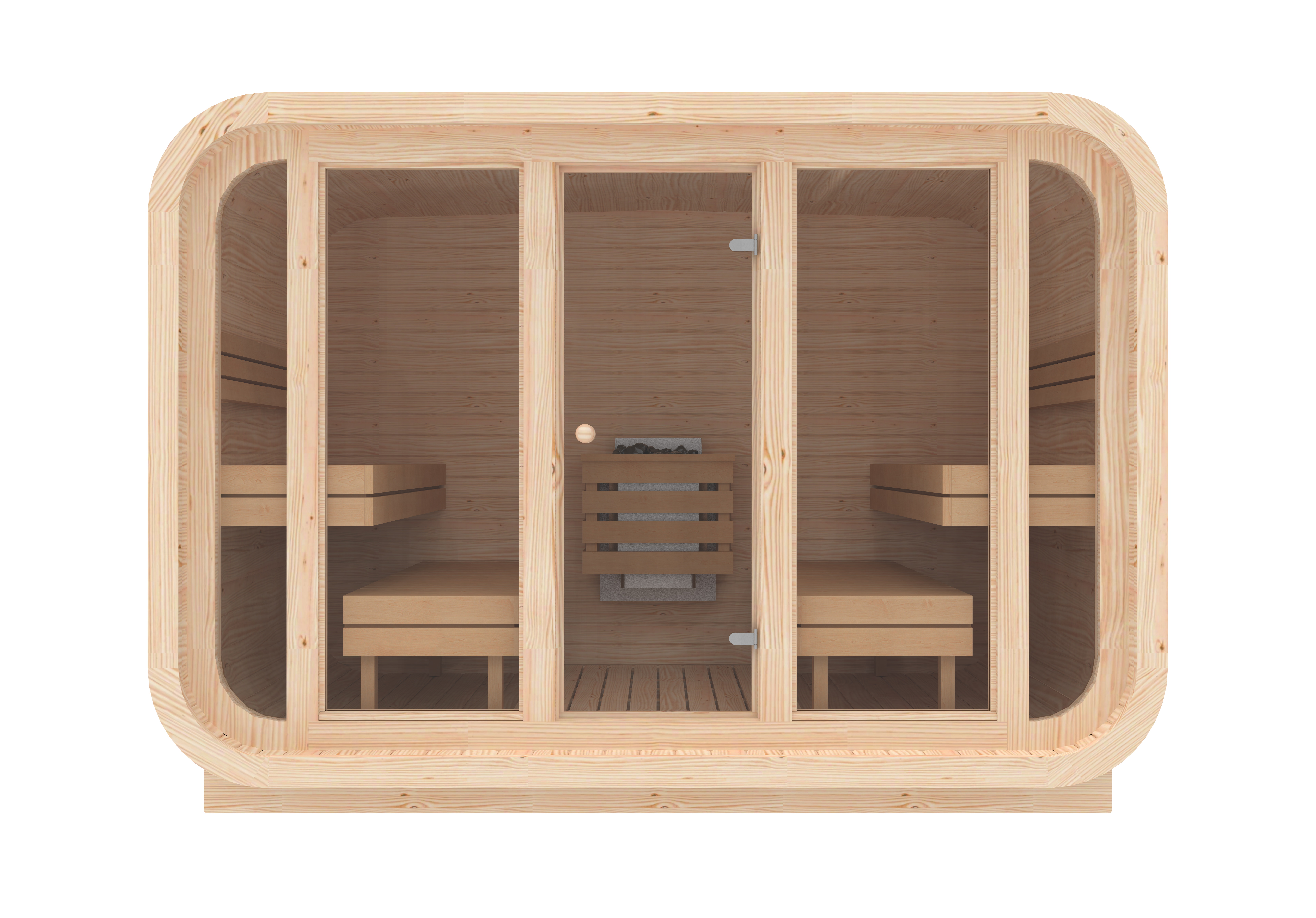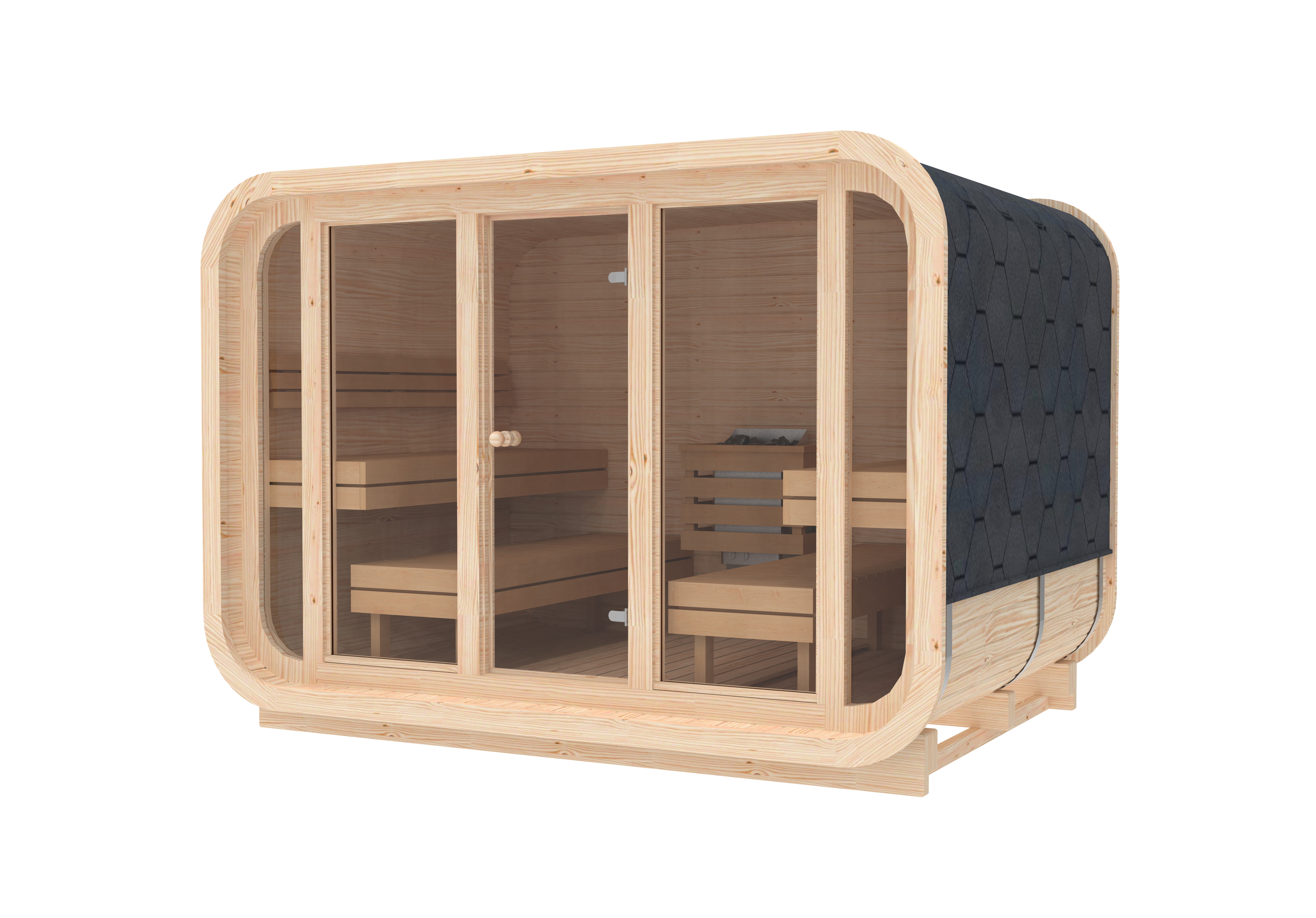 - Bausatz 4-eckige Fasssauna mit einer Gesamtlänge von 230 cm