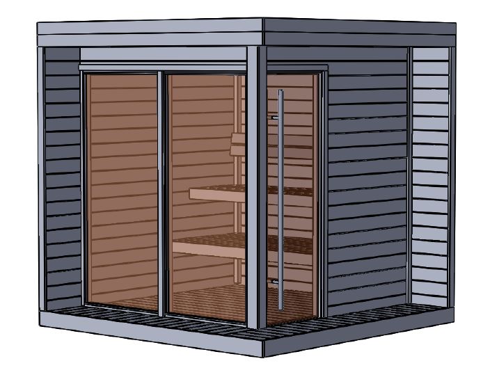 Das Saunahaus hat eine Länge von 229 cm und eine Breite von 229 cm, der Saunaraum hat die Abmaße 177 x 177 cm.
